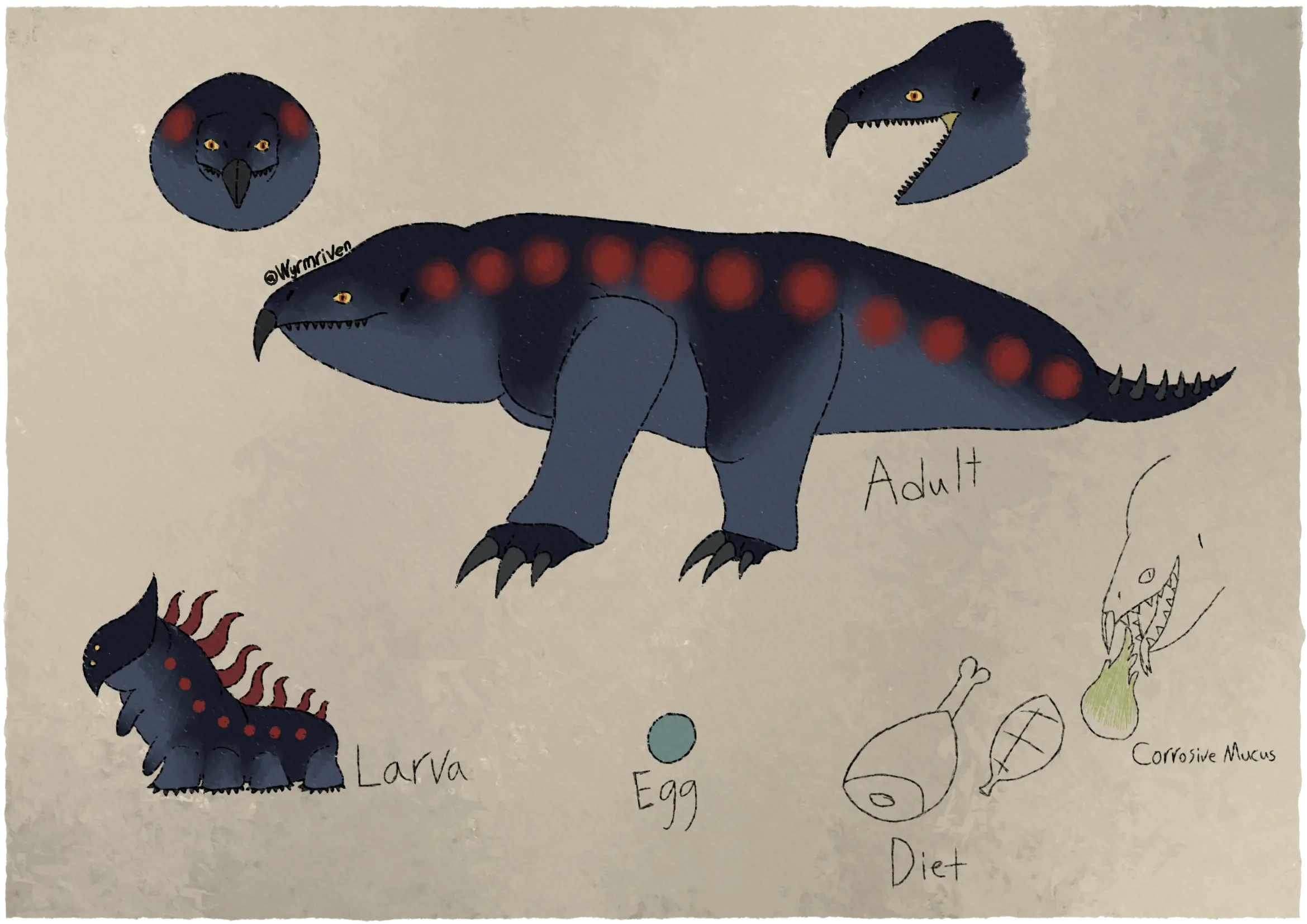 This dragon originated from a dream I had in 2023, it is because of this dream that dragons in this world have larvae instead of typical hatchlings. Them firing needles from red spots on their sides was inpired by ribbed newts, while those creatures cannot fire projectiles from their body, I think what they can do is even stranger, as they will pierce the sides of their body with their sharpened ribs in an effort to sting potential predators. That may be my own bias though, I see a dragon that fires needles from its sides and think "dragons can pretty much be and do anything based on what people decided they can do, so it's not too surprising even if I don't see it often". but newts? Newts are much more limited in what they can do, as they are real animals, so seeing this kind of strange behavior feels a lot more unique. Back on topic, because I couldn't fully remember what it looked like in the original dream, I filled in details based on how I wanted it to live. So, I gave it huge claws meant for burrowing, thagomizers for additional defense, and red spots to give it extra color (and to serve as a warning to predators).