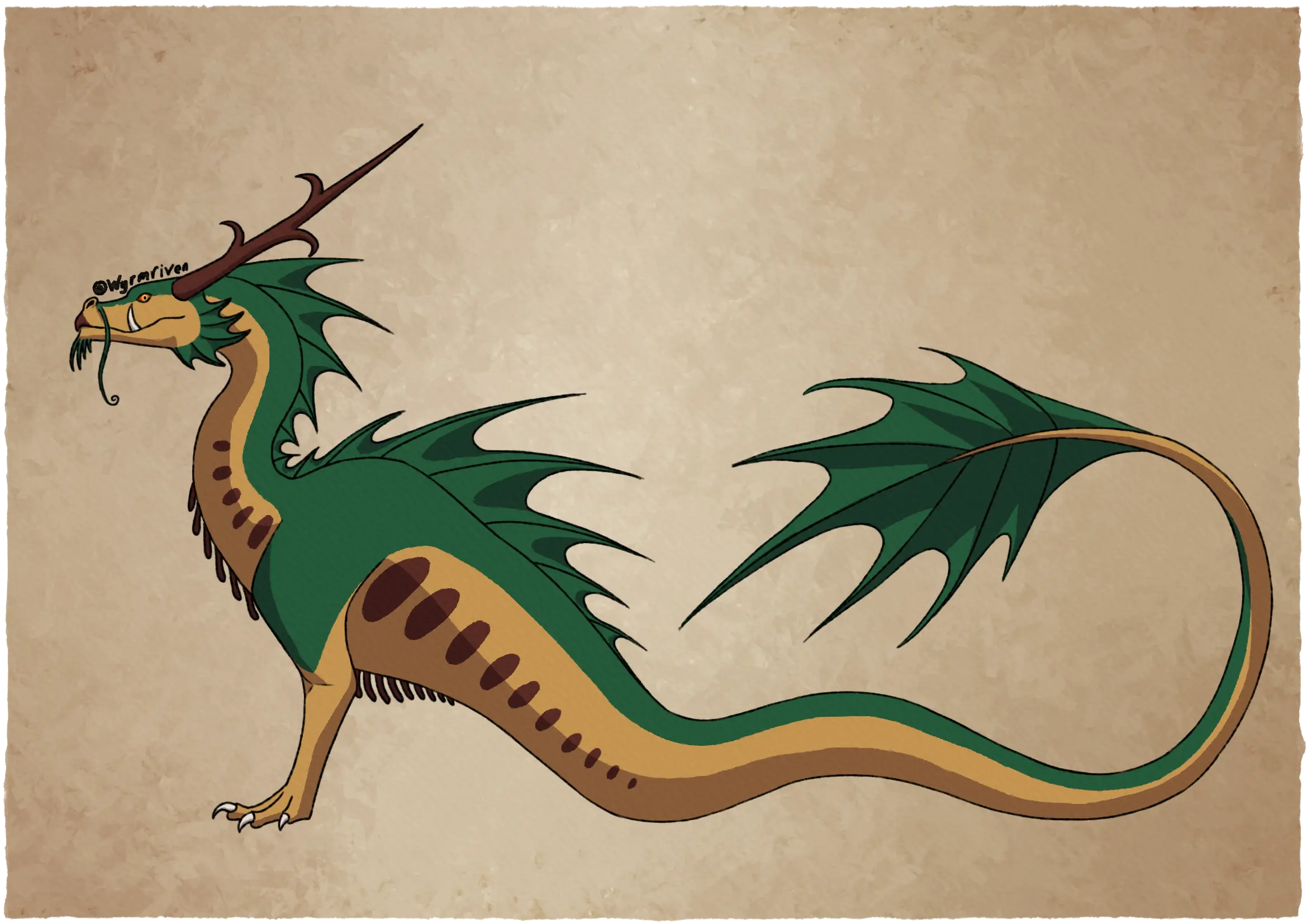 Verdigris is a rather high-ranking Lesser Dragon due to her elaborate ornamentation and the extremely rare ability to fly without wings, though she only has two limbs total. She has a rather high opinion of herself and tends to brag about everything she does, though she has an equally high opinion of those she considers to be friends, and it does not take long for her to view another dragon as a friend. While she is known for being relentlessly positive, she holds many records in her colony's arena because of her agility, venom, and iridescent acid spit, and so far, none have defeated her. She loves eating eels and enjoys watching other dragons do their thing.